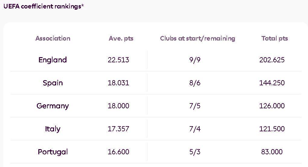 小组赛过后,英格兰在欧足联系数排名中遥遥领先,该排名衡量的是每个国家的俱乐部在本赛季欧洲三项赛事中的表现。只要英超能保持前两名的位置,那么联赛第五就能连续第二个赛季直接获得欧冠小组赛正赛资格。