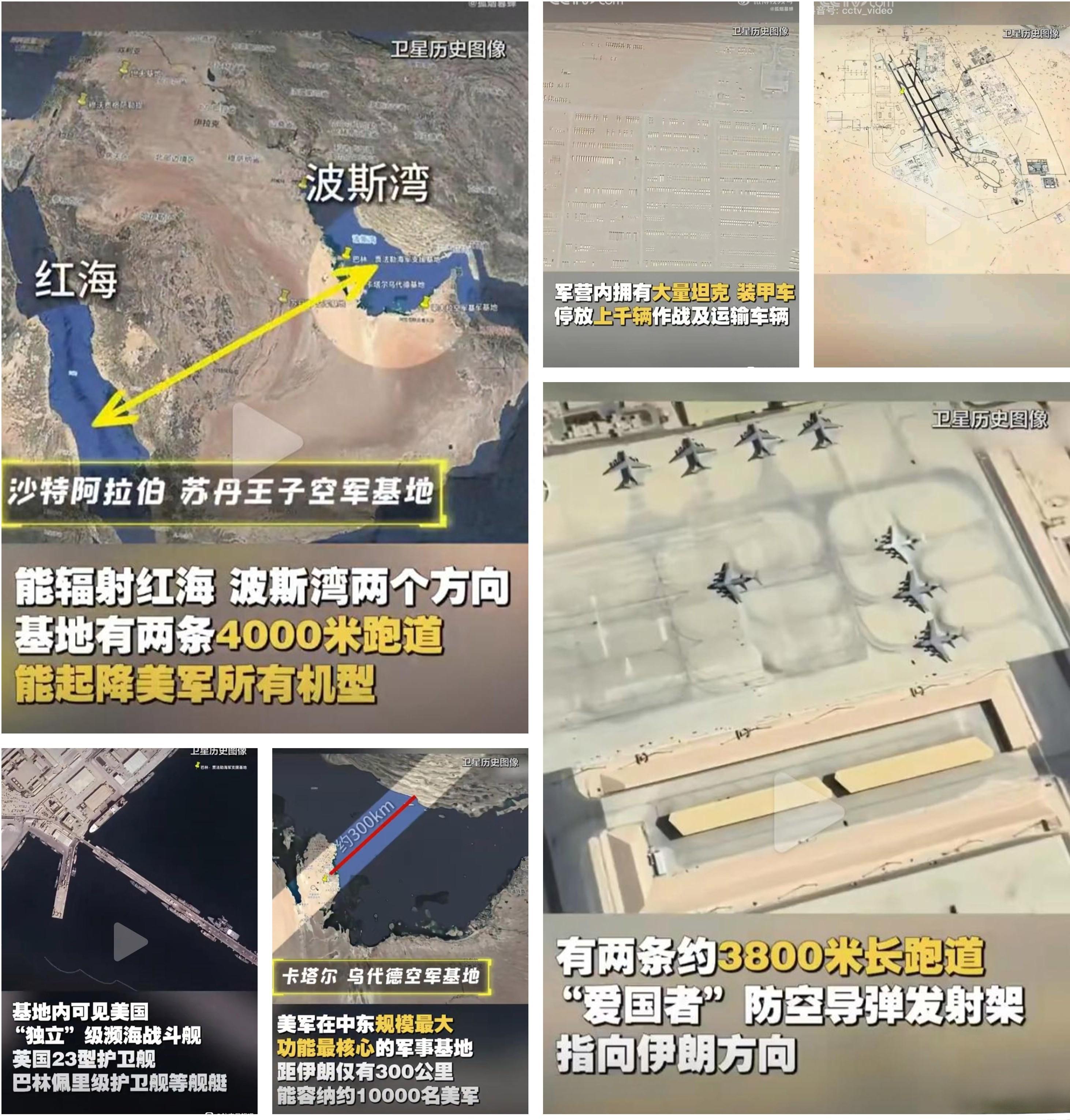 早在美以联军行动开始前,央视就已经公开展示了美军在中东多处关键基地的卫星图像,包括卡塔尔乌代德空军基地、沙特苏丹王子空军基地等核心节点。
